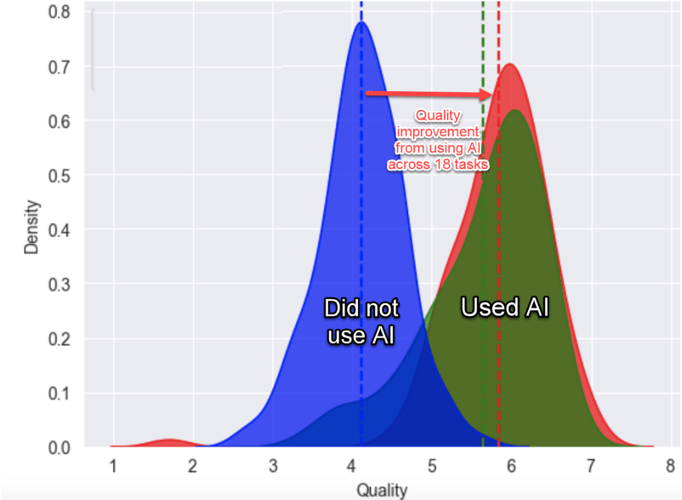 Quelle: Dell'Acqua, F., McFowland III, E., Mollick, E. R., Lifshitz-Assaf, H., Kellogg, K., Rajendran, S., Krayer, L., Candelon, F., & Lakhani, K. R. (2023). Navigating the jagged technological frontier: Field experimental evidence of the effects of AI on knowledge worker productivity and quality (Harvard Business School Technology & Operations Mgt. Unit Working Paper No. 24-013). SSRN. https://doi.org/10.2139/ssrn.4573321:contentReference[oaicite:5]{index=5}
