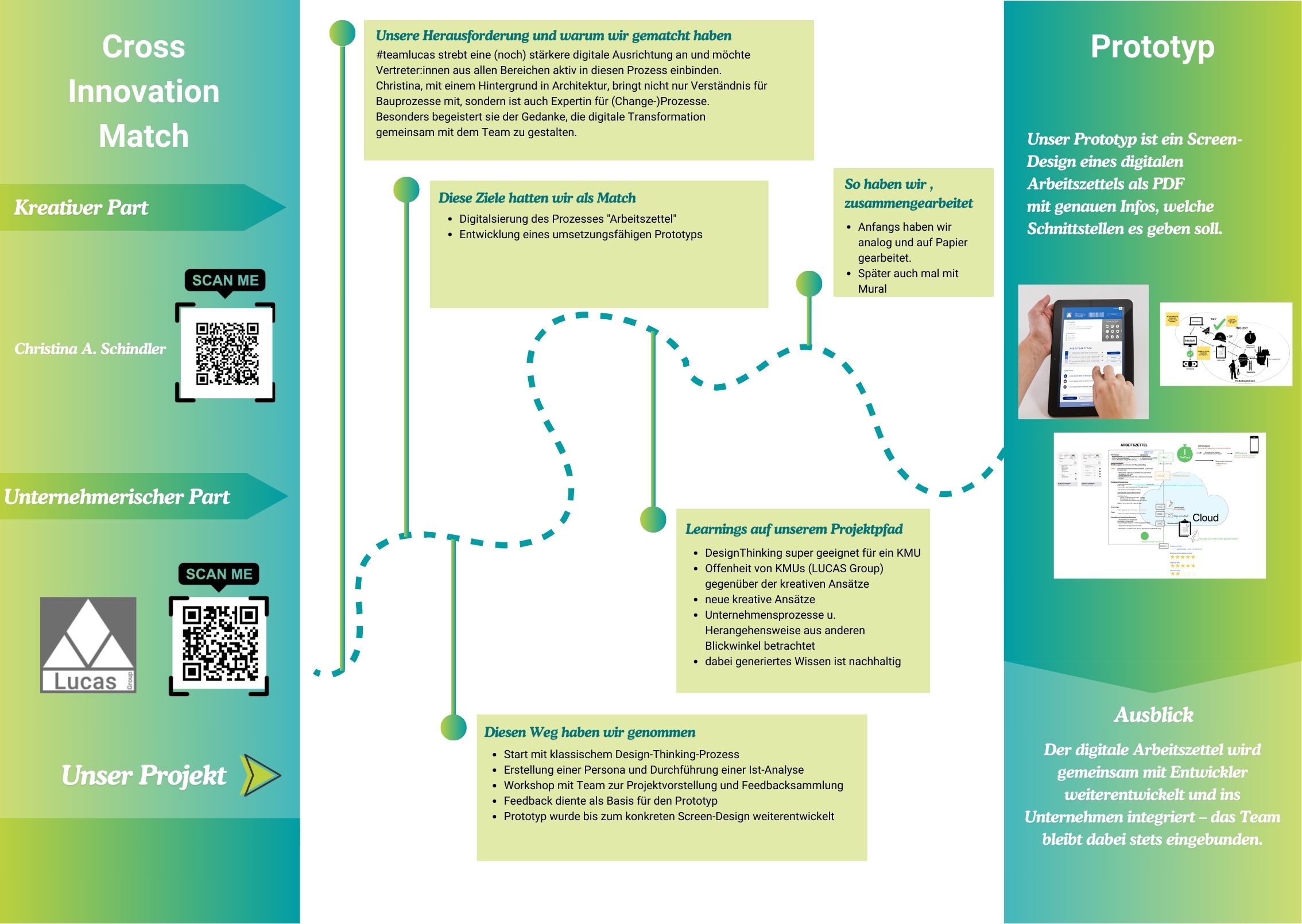 Gemeinsam arbeiteten sie mit klassischen Design-Thinking-Methoden, entwickelten Personas, führten Workshops durch und sammelten direktes Team-Feedback. Daraus entstand ein konkreter Prototyp in Form eines Screen-Designs für einen digitalen Arbeitszettel – inklusive geplanter Schnittstellen.