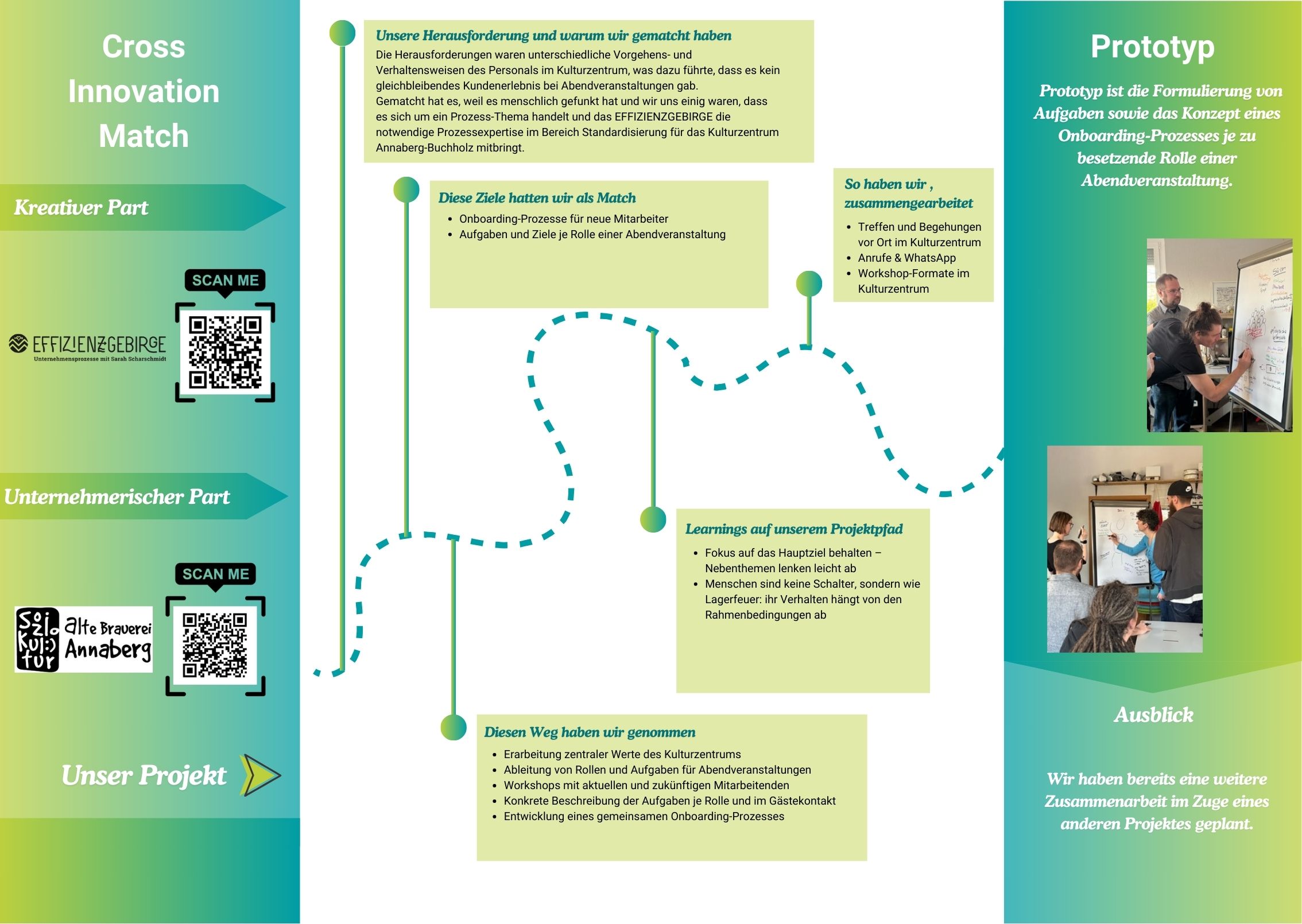 Annett Löser vom Jugend- & Kulturzentrum Alte Brauerei Annaberg e.V. und Sarah Scharschmidt von EFFIZIENZGEBIRGE haben sich im Rahmen von CIMIS 2 der Herausforderung gestellt, ein einheitliches Kundenerlebnis bei Abendveranstaltungen zu schaffen. Unterschiedliche Vorgehensweisen im Team führten bislang zu Inkonsistenzen – ein klarer Fall für Prozess-Expertise.