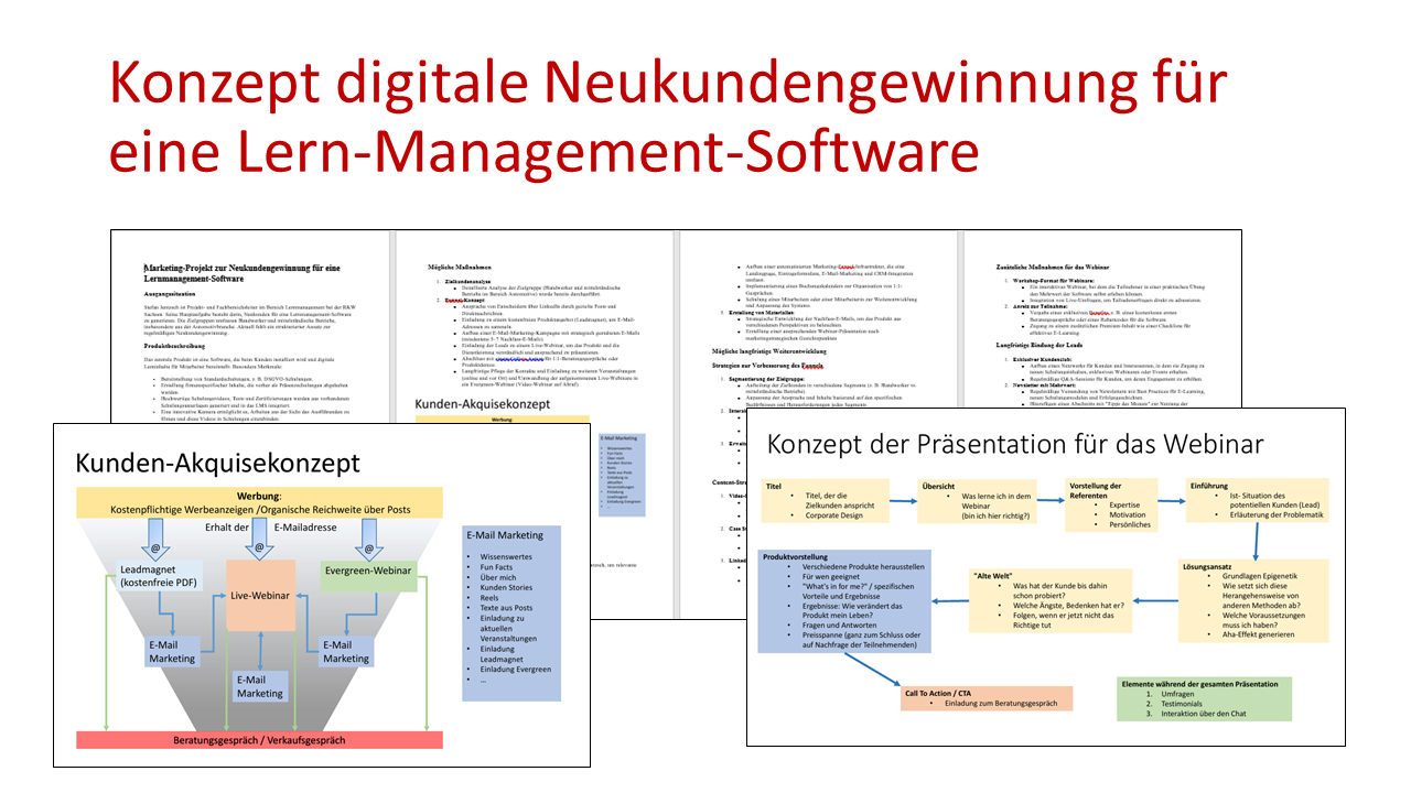 Gemeinsam entwickelten sie ein Konzept zur (halb-)automatisierten Leadgenerierung. Im Zentrum steht ein digitaler Leitfaden, der potenzielle Kund*innen anhand eines konkreten Use Cases anspricht. Dieser wird über eine Landingpage verbreitet und in ein E-Mail-Funnelsystem überführt – inklusive Webinar und recycelten LinkedIn-Inhalten.
